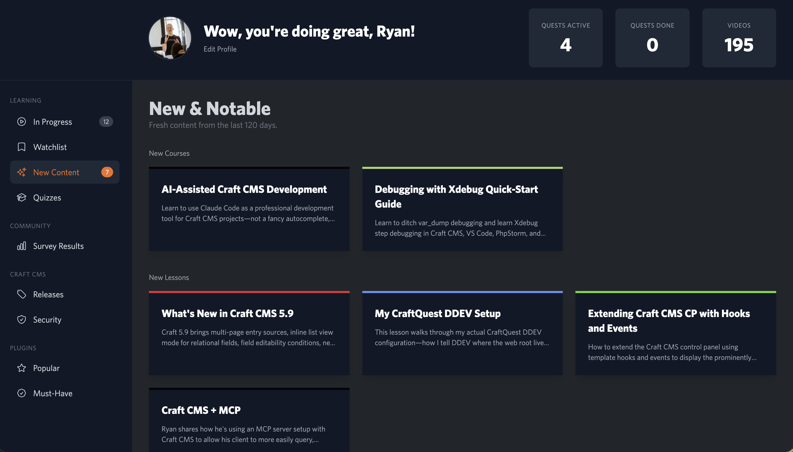 In addition to working on the AI-Assisted Craft Development course, I've been improving CraftQuest with quizzes, course update notifications, a smarter dashboard, community survey results, and performance improvements.